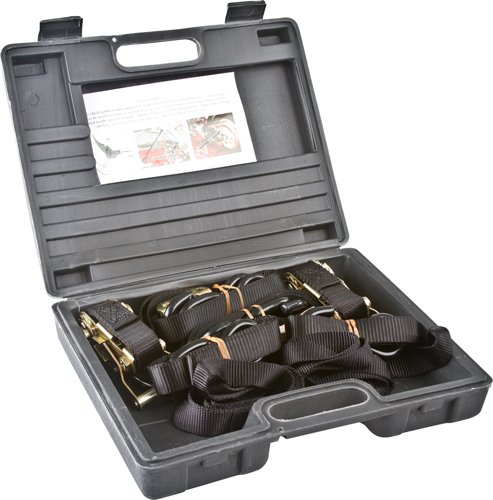 Motorcycle Tie Down Kit includes (2) 1" Ratchet S Hook Straps, (2) 1" Cam Buckle S-Hook Straps, and (4) Soft Loops in a hard plastic carrying case.