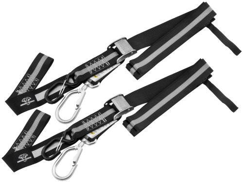 Super heavy-duty buckle, thumb lever and hooks insure these tiedowns can secure the heaviest bikes.